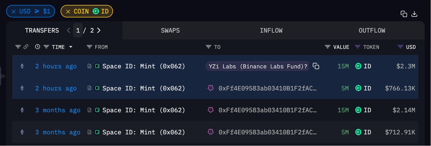 23일 온체인 분석 계정 ai_9684xtpa에 따르면, 가상자산 프로젝트 스페이스 아이디(ID)가 이지 랩스(구 바이낸스 랩스) 연관 주소로 2000만개 ID 토큰(약 43억원)을 이체했다.
