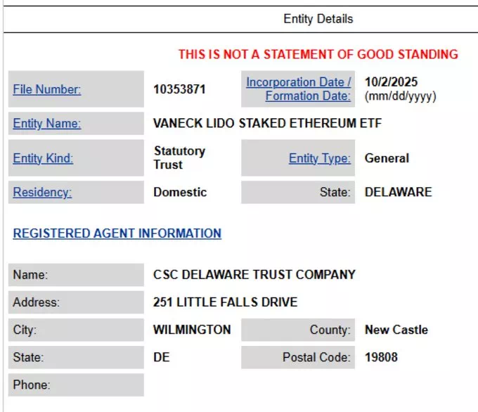 델라웨어주 공식 법인등록 기록에 따르면 ‘반에크 리도 스테이킹 이더리움 ETF(VANECK LIDO STAKED ETHEREUM ETF)’가 10월 2일(현지시간) 법정 신탁(Statutory Trust) 형태로 등록됐다.