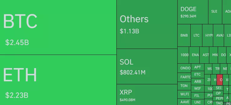 이 가운데 롱(매수) 포지션 청산은 78억4000만달러(약 11조2000원), 숏(매도) 포지션 청산은 15억3000만달러(약 2조2000억원)로 집계됐다.