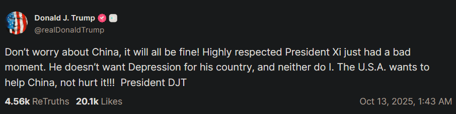 5시간 전 도널드 트럼프 미국 대통령은 자신의 트루스 소셜에서 “중국은 걱정하지 말라. 존경하는 시진핑 국가주석은 단지 좋지 않은 순간을 겪었을 뿐”이라며 “그는 자국 경제가 침체(Depression)에 빠지길 원하지 않으며, 나 역시 그렇다”고 올렸다.
