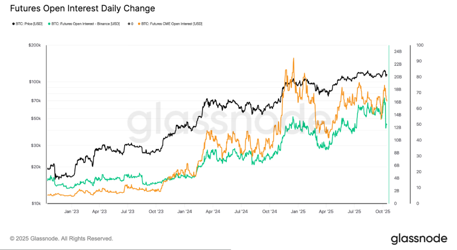 글래스노드에 따르면, 비트코인 시세가 12만2000달러(약 1억7400만원)에서 10만7000달러(약 1억5500만원)로 하락하면서 달러 기준 OI 감소폭이 확대됐다.