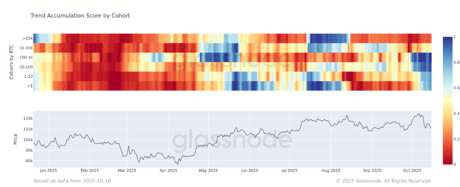 또한 글래스노드의 ‘축적 트렌드 점수(Accumulation Trend Score)’에 따르면 1만BTC 이상을 보유한 고래들이 주된 매도 주체로 나타났다. 1,000~1만BTC 보유 집단은 중립적(0.5)인 반면, 1,000BTC 미만 보유자는 순매수세를 유지했다. 글래스노드는 고래들의 순매도가 8월 이후 지속되고 있다고 설명했다.