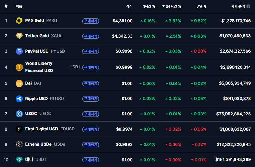 금 연동 스테이블코인이 지난 24시간 동안 주요 100대 가상자산 수익률을 모두 웃돌았다.