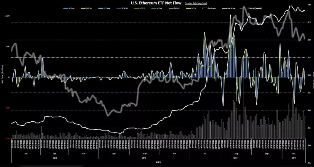 10월 23일 트레이더T에 따르면, 현지 시간으로 22일 미국 이더리움 현물 ETF 시장에 총 1794만 달러(약 252억원)가 순유출로 집계됐다.