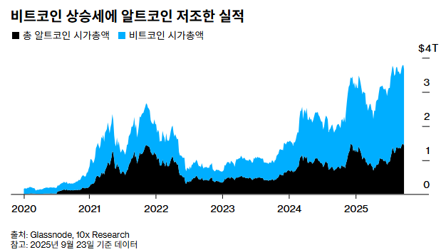 암호화폐 시장 분석 업체 10x리서치는 보고서에서 “한국 개인투자자들이 암호화폐 관련 주식과 다른 주식시장으로 관심을 옮기지 않았다면, 알트코인 시가총액은 현재보다 약 8000억달러 높았을 것”이라며 “이번 사이클에서 알트코인은 신규 자금을 충분히 끌어들이지 못했다”고 평가했다.