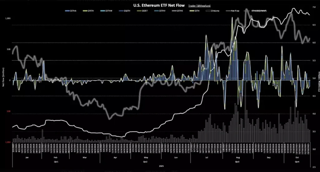 10월 25일 트레이더T에 따르면, 현지 시간으로 10월 24일 미국 이더리움 현물 ETF 시장에서 총 9373만 달러(약 1342억원)가 순유출로 집계됐다.