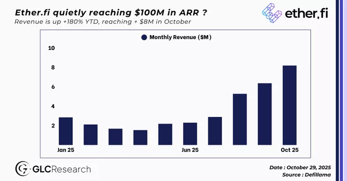 블록체인 리서치업체 GLC는 29일 엑스(X)를 통해 이더파이(Ether.fi)의 연간 수익이 1억달러(약 1430억원)에 근접하고 있으며, 10월 한 달 매출이 800만달러(약 114억원)를 넘었다고 전했다. 이더파이의 올해 누적 매출 증가율은 180%다.