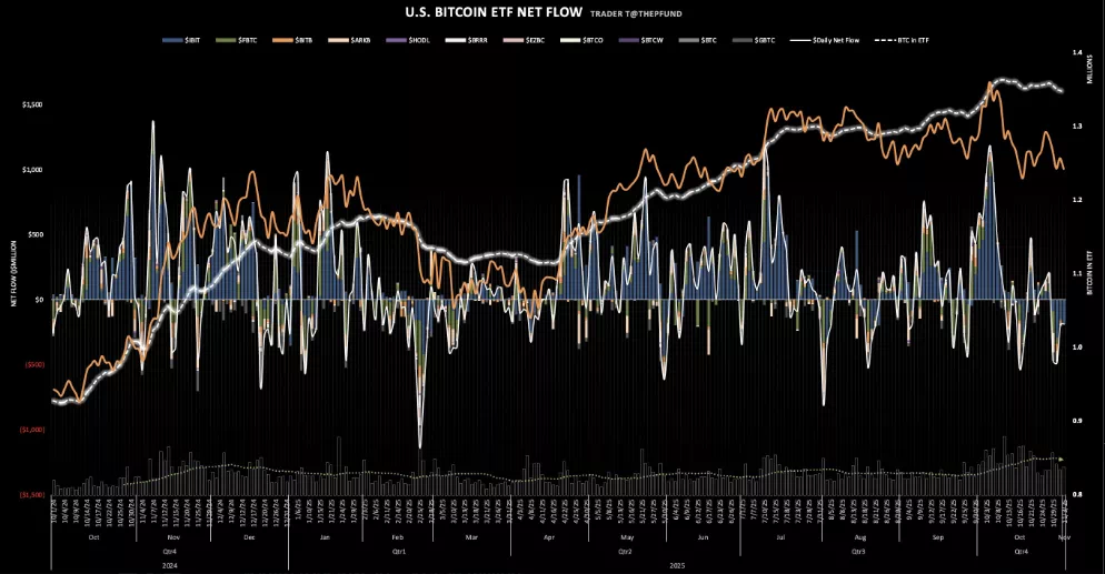 11월 4일 트레이더T에 따르면, 현지 시간으로 11월 3일 미국 비트코인 현물 ETF 시장에서 총 1억8,784만 달러(약 ,630억원)가 순유출로 집계됐다.