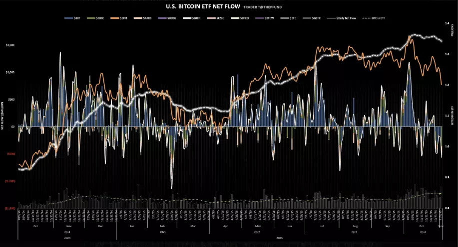 11월 5일 트레이더T에 따르면, 현지 시간으로 11월 4일 미국 비트코인 현물 ETF 시장에서 총 5억6,640만 달러(약 8,153억원)가 순유출된 것으로 집계됐다.