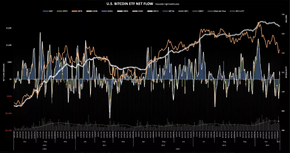 11월 6일 트레이더T에 따르면, 현지 시간으로 11월 5일 미국 비트코인 현물 ETF 시장에 총 1억3,594만 달러(약 1,960억원)가 순유출된 것으로 집계됐다.
