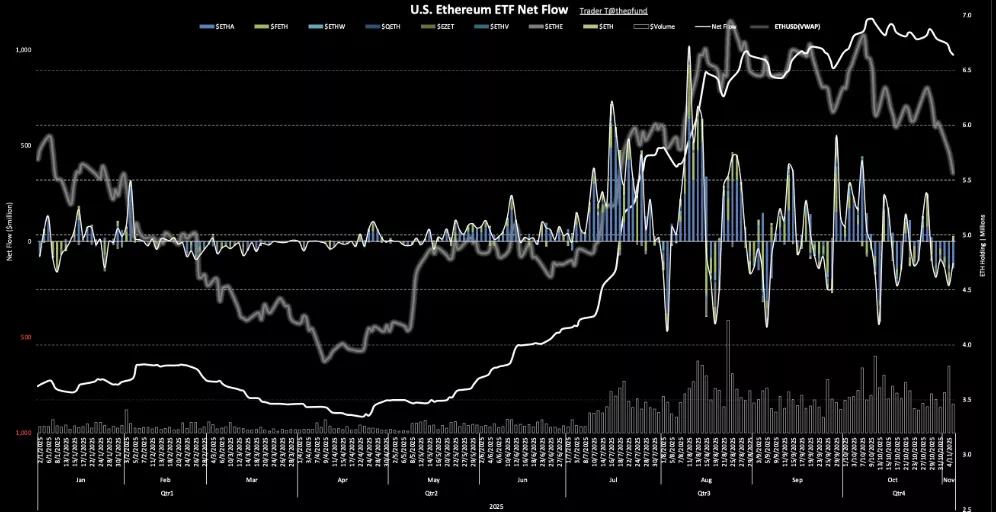 11월 6일 트레이더T에 따르면, 현지 시간으로 11월 5일 미국 이더리움 현물 ETF 시장에 총 1억1,295만 달러(약 1,628억원)가 순유출된 것으로 집계됐다.