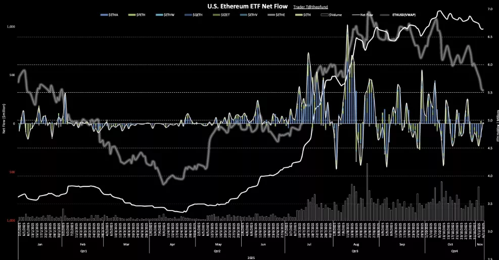 11월 7일 트레이더T에 따르면, 현지 시간으로 6일 미국 이더리움 현물 ETF 시장에 총 909만 달러(약 132억원)가 순유입으로 집계됐다.