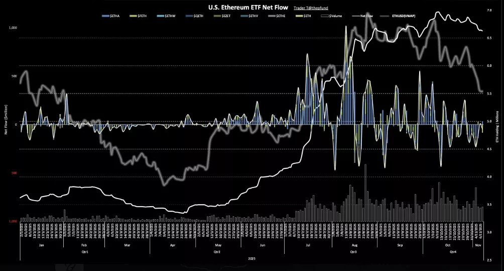 11월 8일 트레이더T에 따르면, 현지 시간으로 7일 미국 이더리움 현물 ETF 시장에서 총 4810만 달러(약 698억원)가 순유출로 집계됐다.