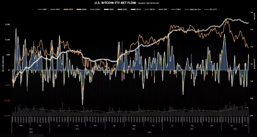 11월 12일 트레이더T에 따르면, 현지 시간으로 11일 미국 비트코인 현물 ETF 시장에서 총 5억2414만 달러(약 7642억원)가 순유입으로 집계됐다.