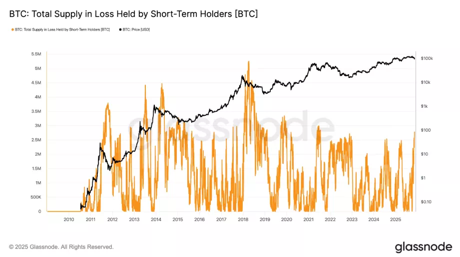단기 보유자(STH)가 보유한 비트코인 손실 물량이 FTX 붕괴 시기 이후 가장 높은 수준으로 늘어났다.