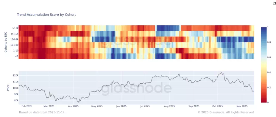 글래스노드의 ‘Accumulation Trend Score’(보유 증가 지표)에서도 이 같은 변화가 확인된다. 1에 가까울수록 순매수를, 0에 가까울수록 순매도를 의미하는데, 최근 1만BTC 이상 보유 지갑의 점수는 0.5 수준으로 매도 압력이 완화됐다. 1,000~1만BTC 지갑은 소폭 순매수 전환했다. 100~1,000BTC 보유 지갑과 1BTC 미만 소액 지갑에서는 가장 강한 매수 신호가 나타났다.