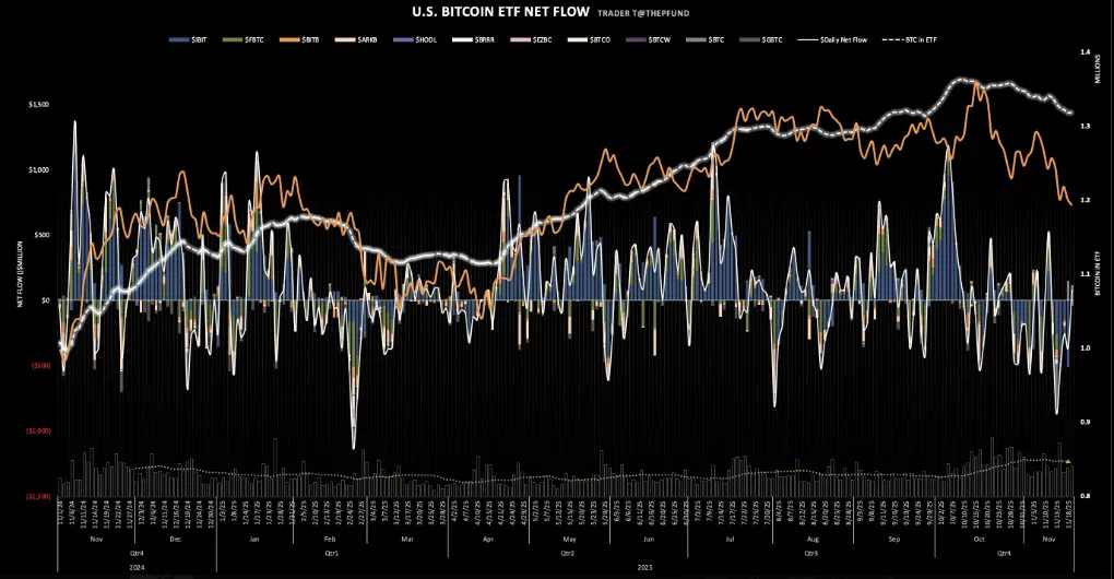 11월 20일 트레이더T에 따르면, 현지 시간으로 19일 미국 비트코인 현물 ETF 시장에 총 7,709만 달러(약 1,132억원)가 순유입으로 집계됐다. 블랙록과 그레이스케일 미니 ETF가 유입을 주도했다.