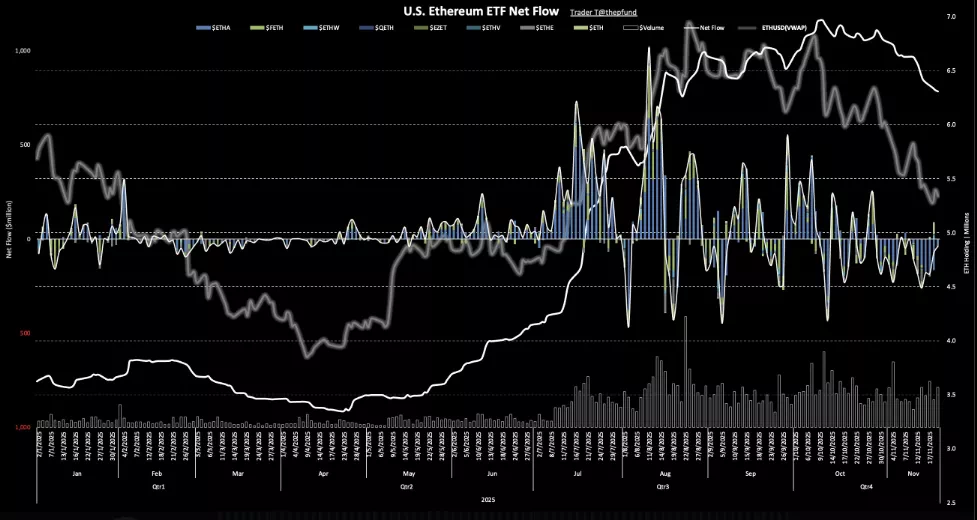 11월 20일 트레이더T에 따르면, 현지 시간으로 19일 미국 이더리움 현물 ETF 시장에 총 3,890만 달러(약 572억원)가 순유출로 집계됐다.