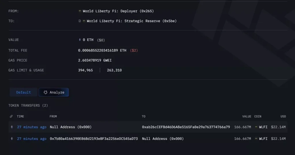 20일 온체인 분석 계정 에밋 갈릭에 따르면, 월드리버티파이낸셜(WLFI) 개발팀이 이날 WLFI 토큰 1억6666만7000개를 긴급 소각하고 복구 주소로 재분배한 것으로 알려졌다.