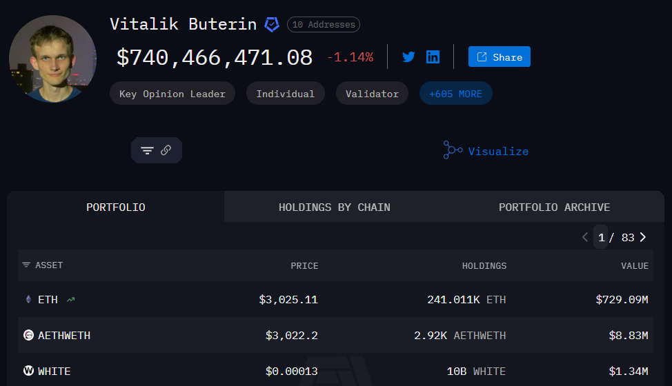 20일, 온체인 분석 플랫폼 아캄 데이터에 따르면 비탈릭 부테린은 약 24만4000개 이더리움을 보유하고 있으며, 규모는 약 7억4000만달러(약 1조900억원) 수준이다.