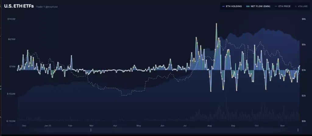 11월 25일 트레이더T에 따르면, 현지 시간 24일 미국 이더리움 현물 ETF 시장에는 총 9,228만 달러(약 1,356억원) 규모의 순유입이 집계됐다.