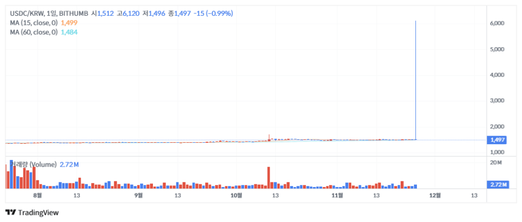 ■ 현상 : 당사 거래소 내 USDC 가격이 일시적으로 급등하여 최고 6,120원을 기록