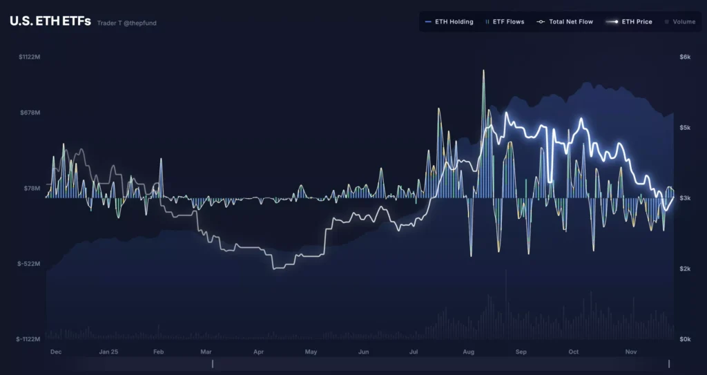 11월 27일 트레이더T에 따르면, 현지 시간으로 26일 미국 이더리움 현물 ETF 시장에 총 6099만 달러(약 896억원)가 순유입으로 집계됐다.