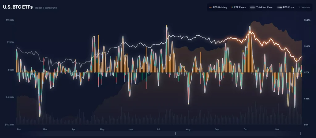11월 29일 트레이더T에 따르면, 현지 시간으로 28일 미국 비트코인 현물 ETF 시장에 총 7,131만 달러(약 1048억원)가 순유입으로 집계됐다.