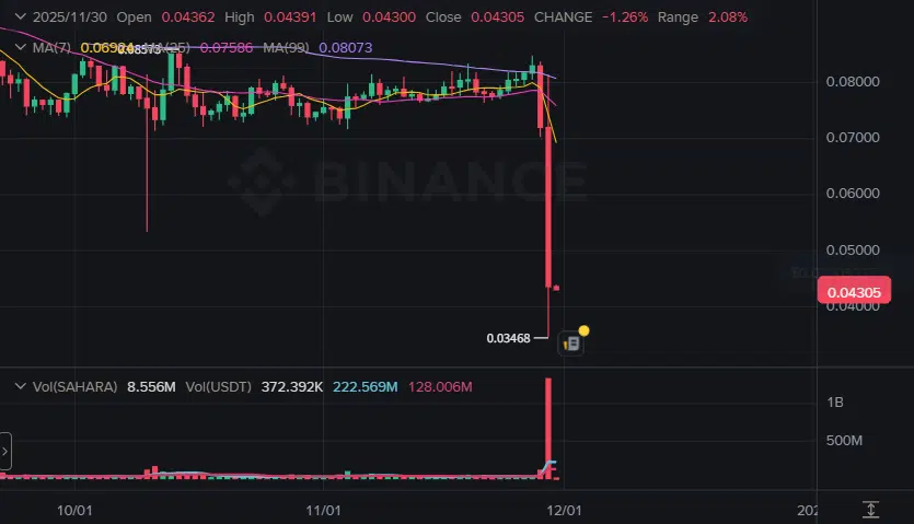 사하라에이아이 토큰은 지난 28일 업비트 기준 122원에서 112원까지 하락했고, 29일에는 한때 67원대로 급락한 뒤 30일 현재 79원대에서 거래되고 있다. 다만 업비트 시세는 현재 20% 김치 프리미엄이 있는 상황이다.