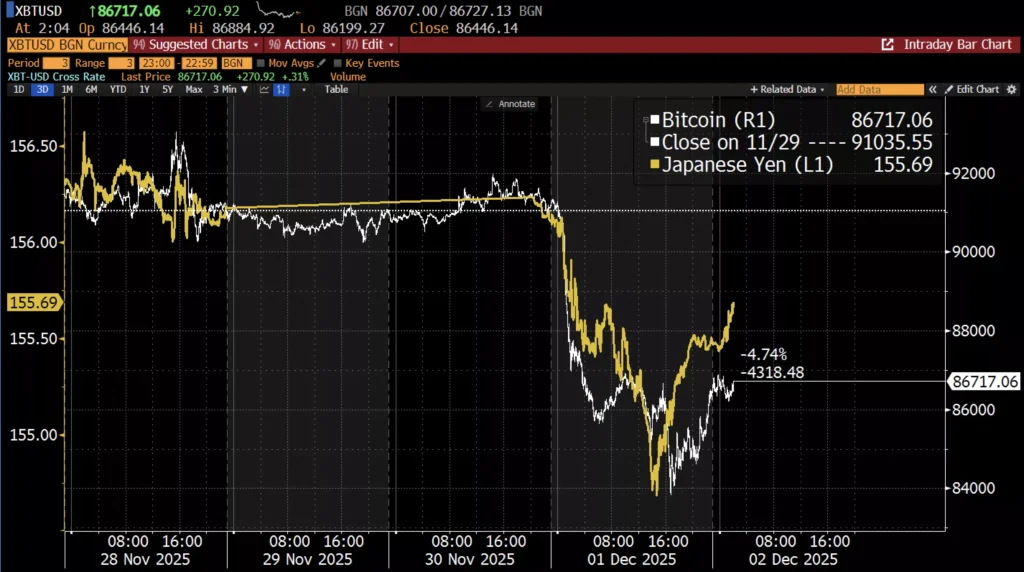글로벌 금융시장에서 일본의 통화정책 전망이 환율과 위험자산 전반에 영향을 주고 있다는 평가 속에, 가상자산 시장이 엔화 변동성과 연동되는 양상이 나타나고 있다는 주장이다.