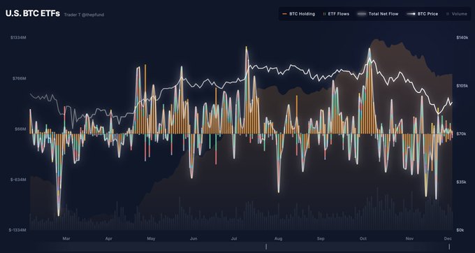 12월 4일 트레이더T에 따르면, 현지 시간으로 3일 미국 비트코인 현물 ETF 시장에 총 1490만 달러(약 219억원)가 순유출로 집계됐다.