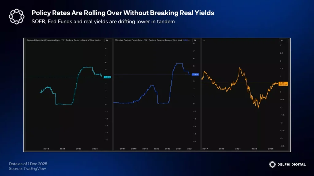 델파이디지털은 2026년에는 통화정책이 가상자산을 포함한 위험자산에 대한 ‘역풍’이 아니라 완만한 ‘순풍’ 역할을 할 수 있다고 예상했다. 특히 기간자산과 대형 자산, 금, 구조적 수요가 뒷받침되는 디지털 자산이 수혜를 받을 수 있다는 전망을 내놨다.