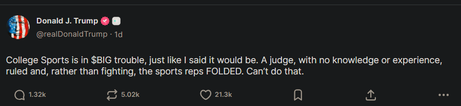 트럼프는 한 판사가 “지식도 경험도 없이 내린 판결”로 대학 스포츠에 문제가 발생했다고 지적했다. 이어 관련 단체들이 맞서지 않고 “포기”했다며 대응 태도를 문제 삼았다.