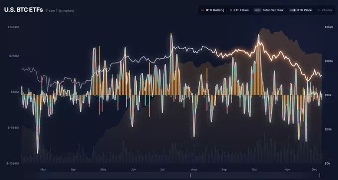 12월 9일 트레이더T에 따르면, 현지 시간으로 8일 미국 비트코인 현물 ETF 시장에 총 6,051만 달러(약 889억원)가 순유출로 집계됐다.