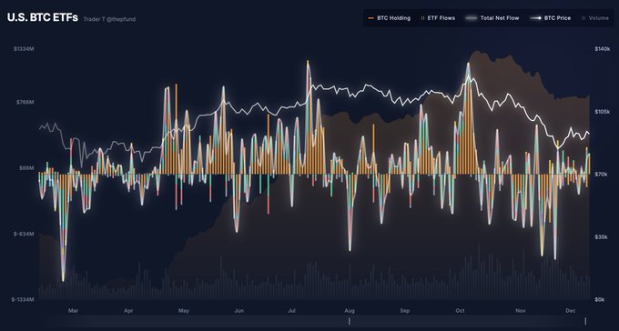 트레이더T는 “예상된 25bp 금리 인하 이후 전반적 유입 규모는 크지 않았으나, 블랙록과 피델리티만 뚜렷한 유입을 기록했다”고 언급했다.