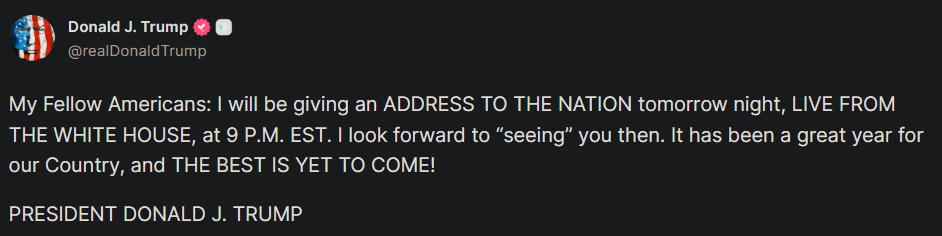 트럼프 대통령은 소셜미디어를 통해 연설 일정을 공개했다. 집권 1년 차가 마무리 국면에 접어든 시점으로, 지지율 하락과 경제 여건 악화가 겹친 상황에서 이뤄지는 연설이다.