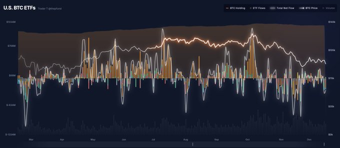12월 17일 트레이더T에 따르면, 현지 시간으로 16일 미국 비트코인 현물 ETF 시장에서 총 2억7737만 달러(약 4077억원)가 순유출로 집계됐다.