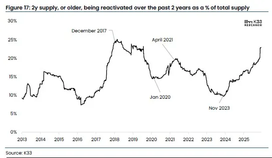 K33리서치는 이를 장기 보유자들의 지속적인 매도로 해석했다.