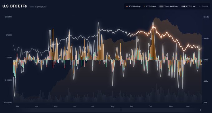 12월 23일 트레이더T에 따르면, 현지 시간으로 22일 미국 비트코인 현물 ETF 시장에 총 1억4209만 달러(약 2089억원)가 순유출로 집계됐다.