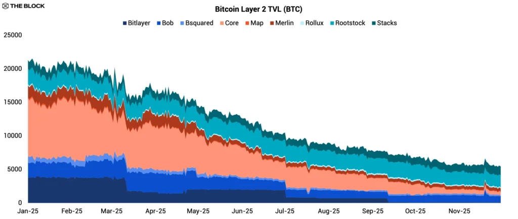 비트코인 L2 TVL은 2025년 들어 74% 이상 감소했다.