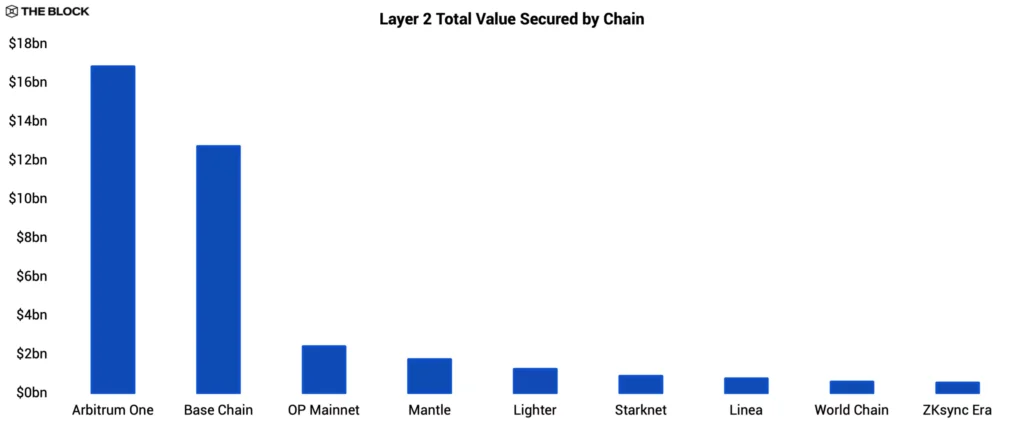 총 예치자산(TVL)보다 범위를 넓힌 총 보호자산(TVS) 기준에서도 베이스와 아비트럼이 합산 75% 이상을 차지하며 동일한 위계를 보였다.
