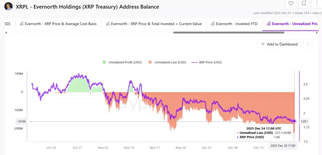 리플 경영진이 후원한 XRP 재무 법인 ‘에버노스 홀딩스’가 엑스알피(XRP) 코인 시세 하락으로 2억2000만달러(약 3234억원) 넘는 평가손실을 안고 있다.