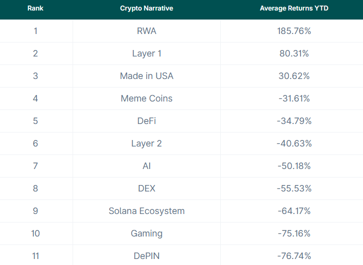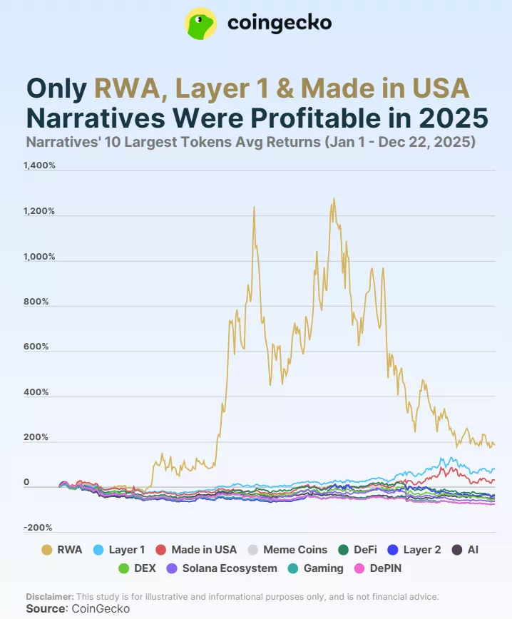 2025년 암호화폐 시장에서 실물자산(RWA)과 레이어1(Layer 1)만이 연간 기준 수익을 기록한 반면, 게임·디핀(DePIN)·인공지능(AI) 등 주요 내러티브는 큰 폭의 하락을 나타냈다.