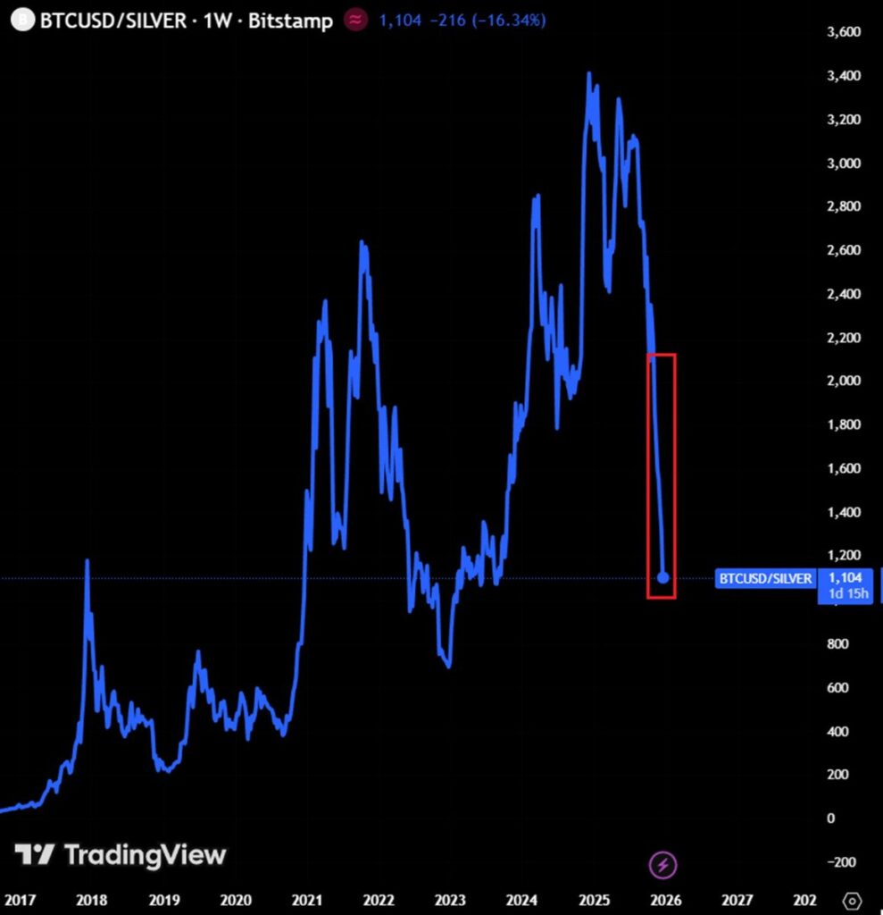 비트코인 대비 1온스당(약 31.1g) 은 비율은 1104로, 2023년 9월 이후 최저 수준을 기록했다. 해당 비율은 5월 이후 67% 하락했다.