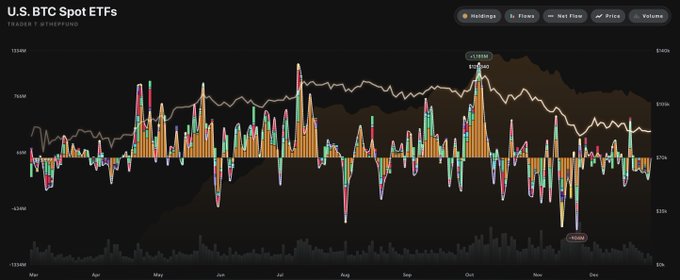 12월 30일 트레이더T에 따르면, 현지 시간으로 29일 미국 비트코인 현물 ETF 시장에 총 1931만 달러(약 278억원)가 순유출로 집계됐다. 전반적으로 거래량은 크지 않았다.