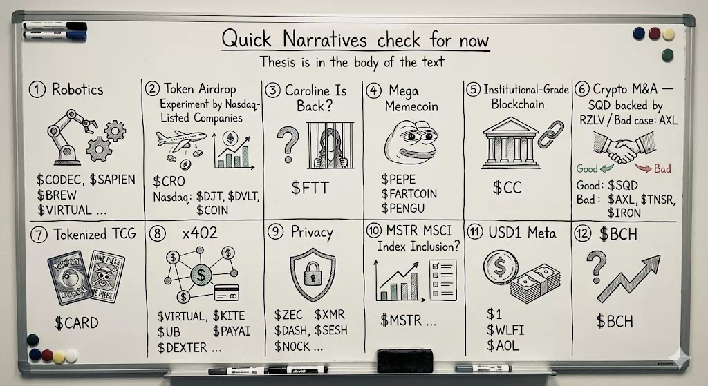 암호화폐 리서치 X계정 레이어지지(Layergg)는 2026년 코인 시장에서 주목할 내러티브 12가지를 소개하며, 1분기 중 RMP를 통한 간접적 양적완화가 나타날 경우 전반적 방향성은 여전히 긍정적일 수 있다고 예상했다.