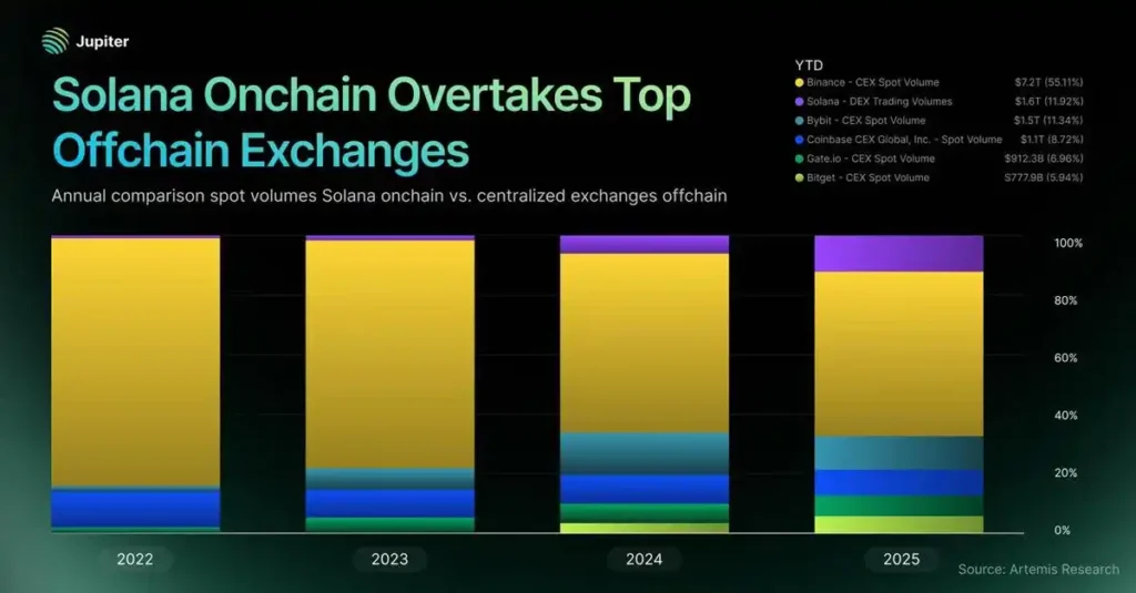5일 탈중앙화 거래소(DEX) 주피터에 따르면 솔라나 블록체인에서 현물 거래량이 2025년 기준 1조6000억달러(약 2304조원)를 기록하며 바이낸스를 제외한 모든 중앙화 거래 플랫폼의 거래량을 넘어섰다.