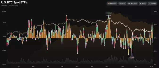 1월 7일 트레이더T에 따르면, 현지 시간으로 6일 미국 비트코인 현물 ETF 시장에 총 2억4000만 달러(약 3480억원)가 순유출로 집계됐다.