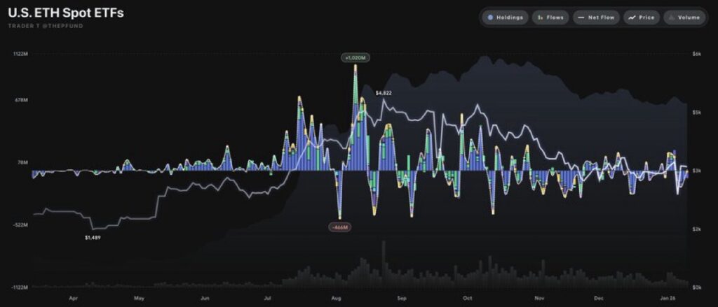 1월 13일 트레이더T에 따르면, 현지 시간으로 12일 미국 이더리움 현물 ETF 시장에 총 527만 달러(약 76억원)가 순유입으로 집계됐다.