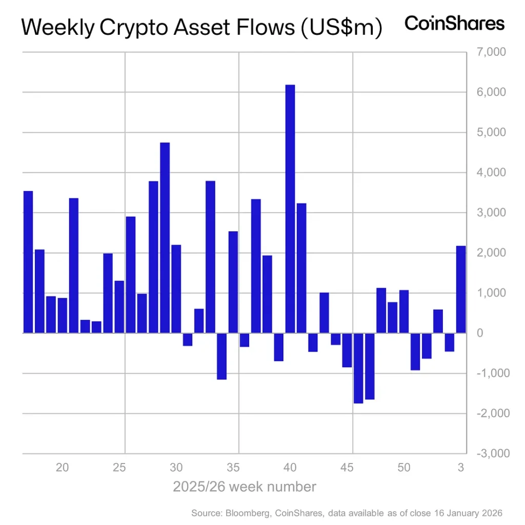 글로벌 디지털 자산 투자상품에 지난주 21억7000만달러(약 3조1899억원)가 들어오며 2025년 10월 이후 가장 큰 주간 유입을 기록했다.